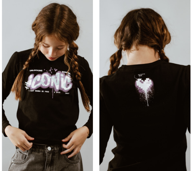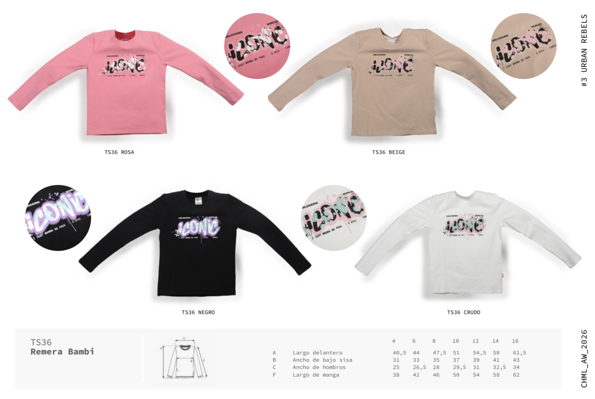 Remera de manga larga con calce relajado y estampa tipo grafiti con relieve, ideal para un look urbano y cómodo. CARACTERÍSTICAS: Composición: 52% Algodón, 46.9% Poliéster, 1.1% Elastano Colores: rosa, negro, beige y crudo Talles del 4 al 16