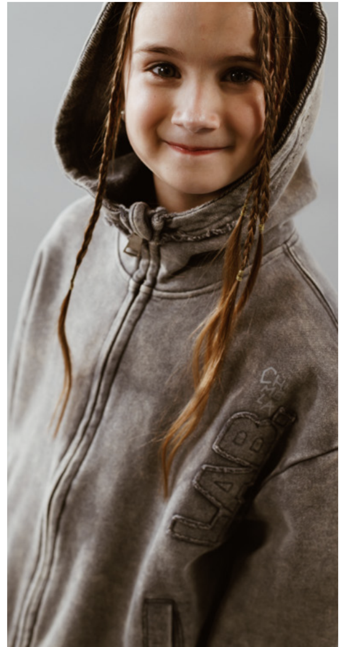 con cierre al tono, bolsillos laterales y detalle de estampa