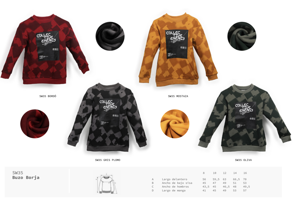 Buzo de frisa full estampado con diseño llamativo en el frente. Una prenda cómoda y divertida para los días más frescos. CARACTERÍSTICAS: Composición: 45% algodón, 55% poliéster Colores: bordó, mostaza, gris plomo y oliva Talles del 8 al 16