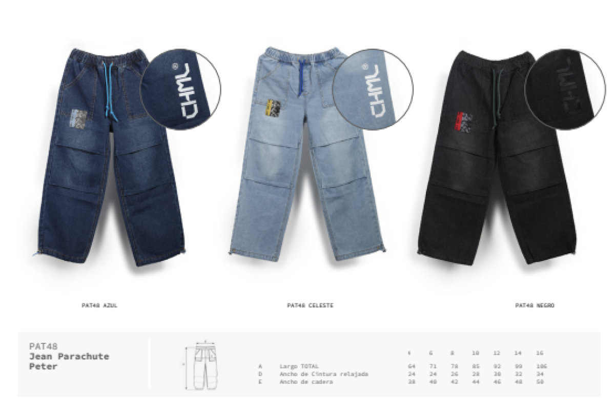 Jean parachute de calce relajado, con cintura elastizada y cordón ajustable. Tiene estampa en la pierna trasera y etiqueta de color en el delantero. CARACTERÍSTICAS: Composición: 75% algodón, 25% poliéster Colores: azul, celeste y negro Talles del 4 al 16