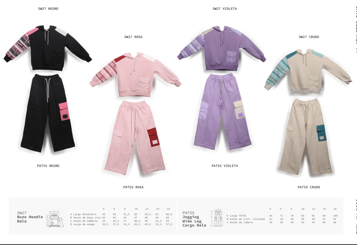 Colores: negro, rosa, violeta y crudo