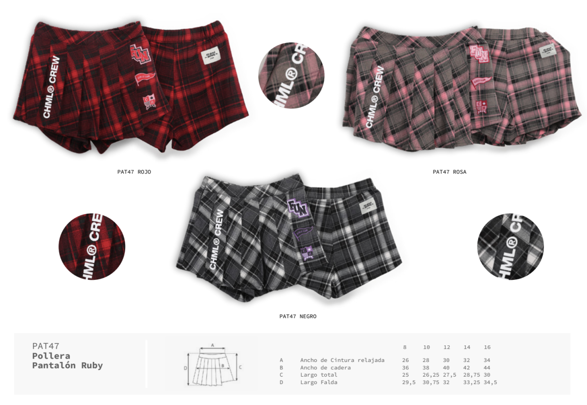 Pollera pantalón escocesa con tablas y escudos bordados que le dan un aire college moderno. Ideal para looks versátiles y cancheros. CARACTERÍSTICAS: Composición: 75% poliéster, 22% rayón, 3% elastano Colores: rojo, rosa y negro Talles del 8 al 16