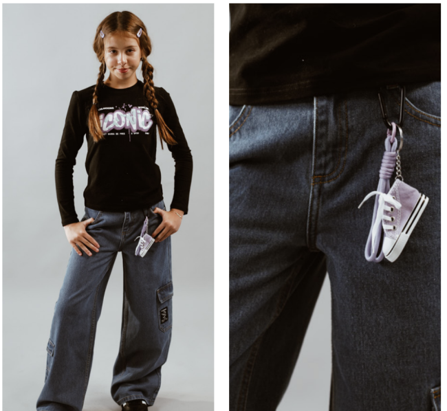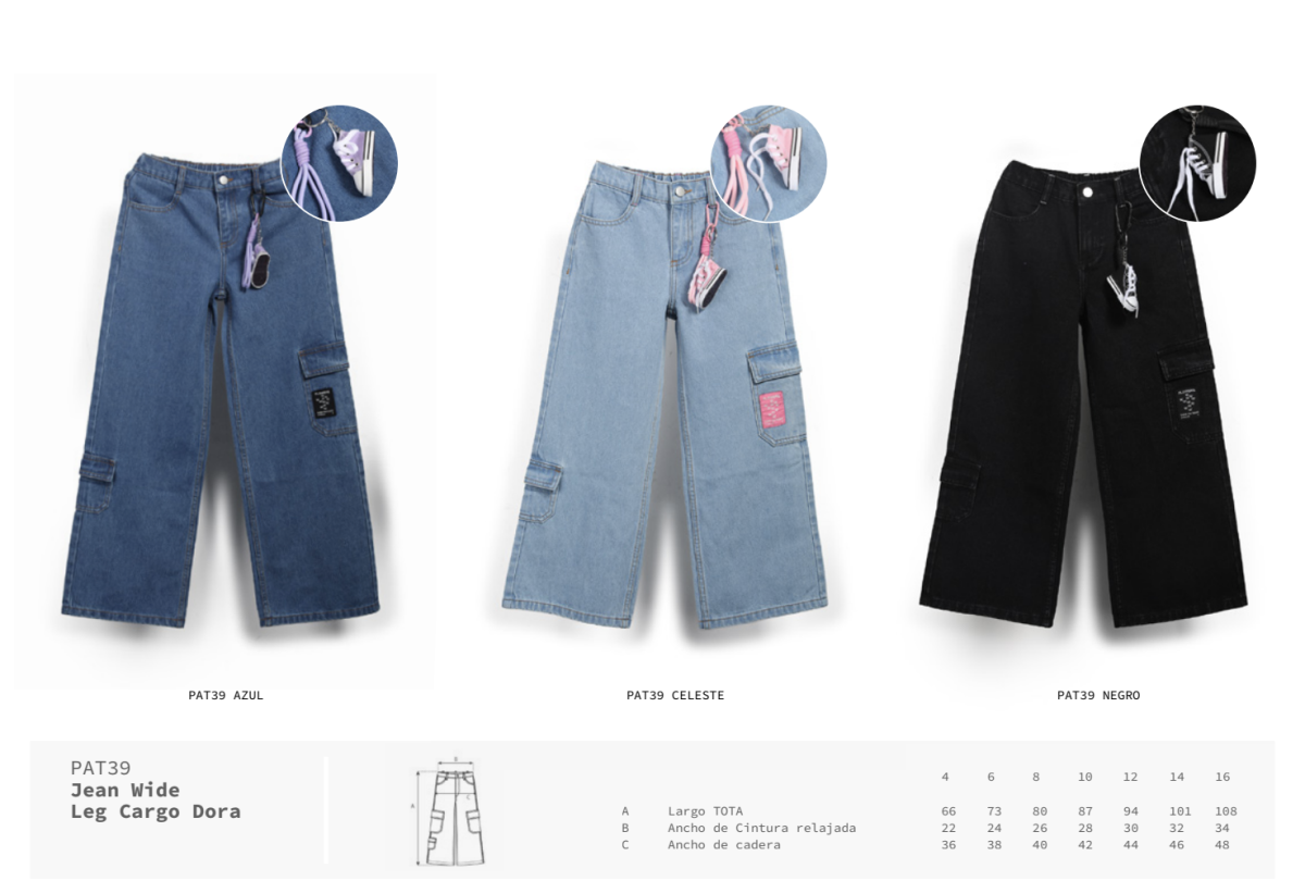 Jean wide leg de denim con bolsillos tipo cargo y calce relajado. Incluye etiqueta decorativa y llavero colgante con forma de zapatilla que suma estilo y personalidad. CARACTERÍSTICAS: Composición: 90% algodón, 10% poliéster Colores: azul, celeste y negro