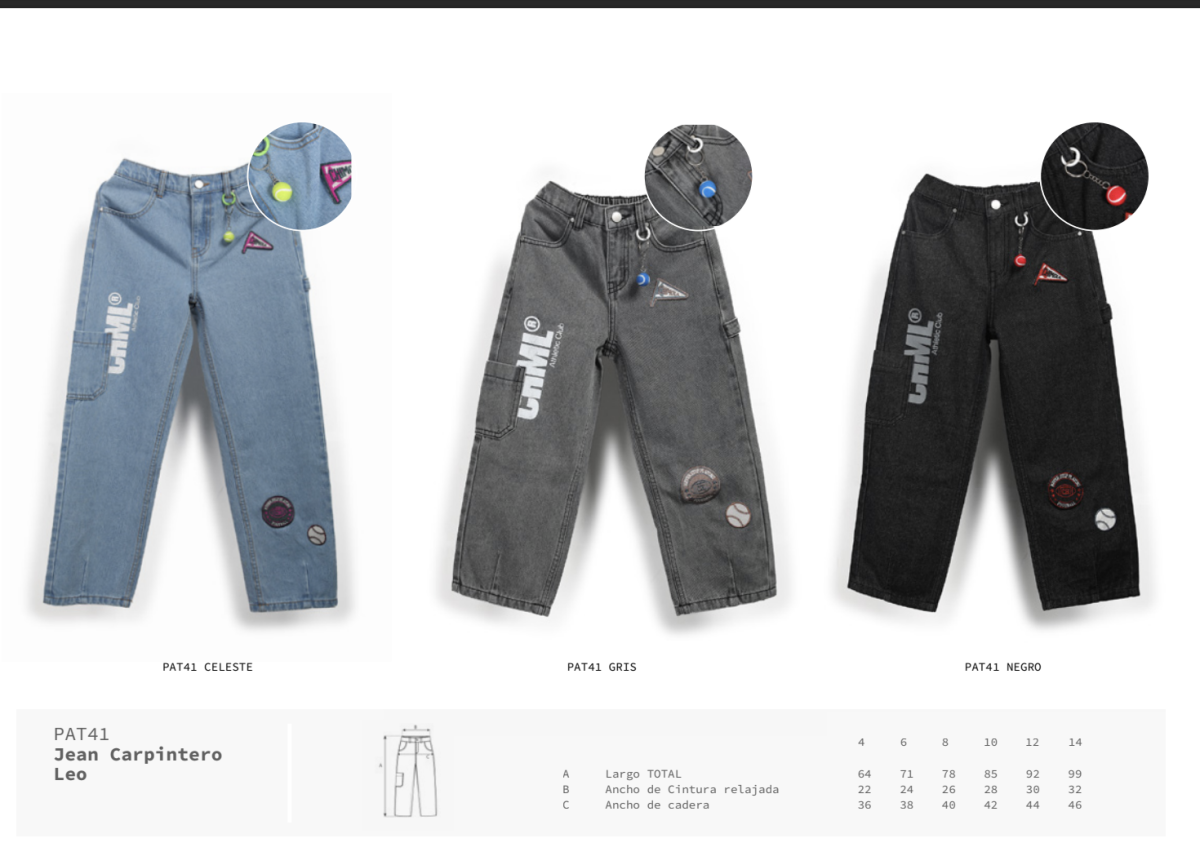 Jean tipo carpintero de calce relajado, con detalles que suman estilo: llavero de pelota de tenis, parches deportivos y estampa en delantero. CARACTERÍSTICAS: Composición: 75% algodón, 25% poliéster Colores: celeste, gris y negro Talles del 4 al 14