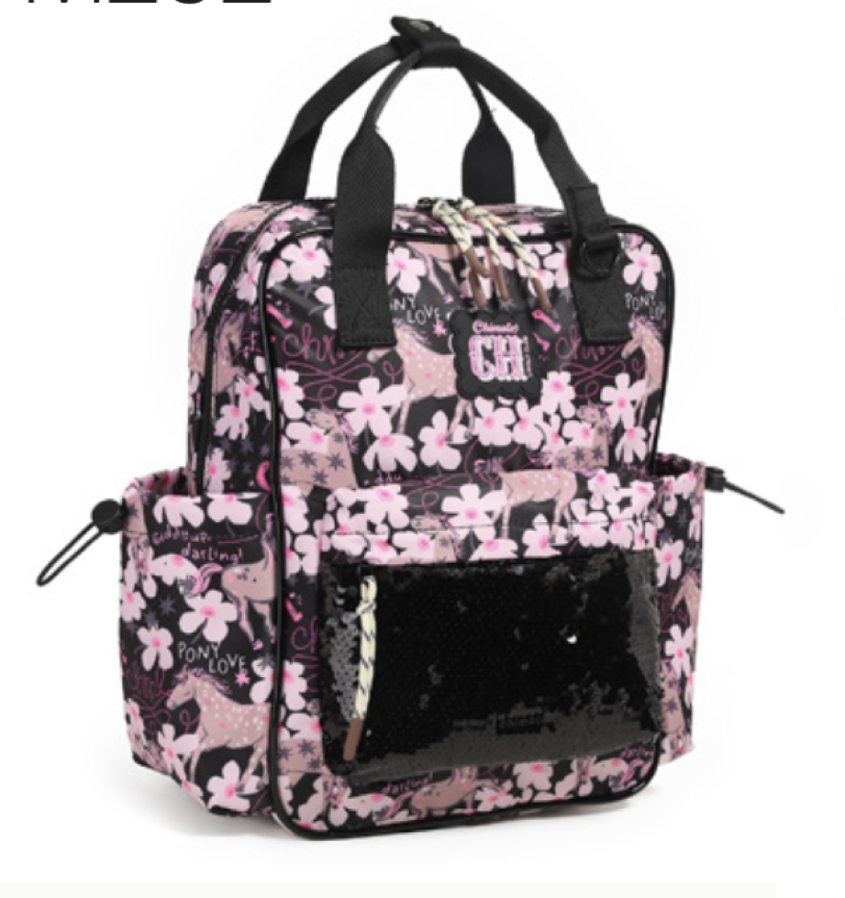MOCHILA CÁPSULA KIDS. CONFECCIONADA EN NYLON ESTAM- PADO Y CON DETALLES DE LENTEJUELAS, ESTA MOCHILA CUENTA CON UN COMPARTIMIENTO PRINCIPAL Y UN BOLSILLO FRONTAL. TAMBIÉN TIENE DOS BOLSILLOS REGULABLES EN LOS LATERALES.