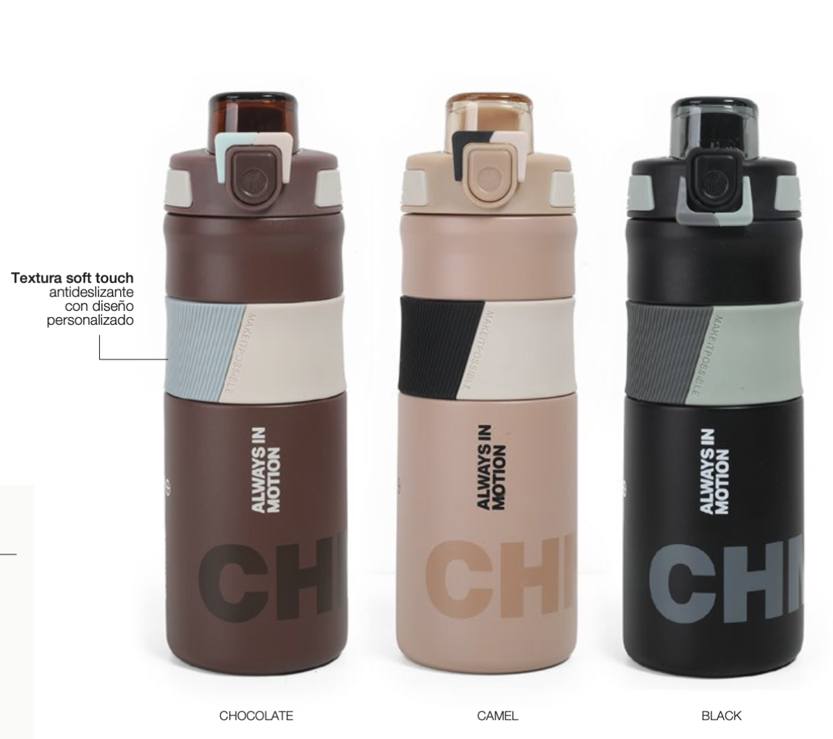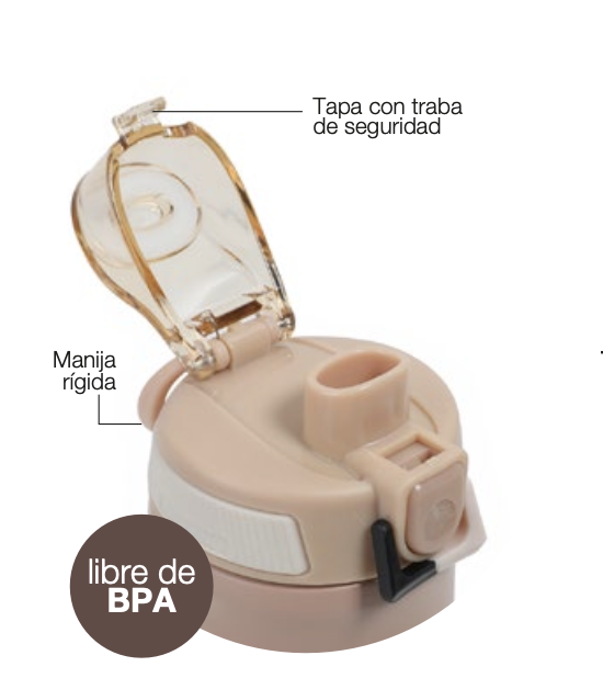 CAPACIDAD: 550ML MEDIDAS: 23*7.2CM COMPOSICIÓN: INTERIOR: ACERO INOXIDABLE 304 EXTERIOR: ACERO INOXIDABLE 201 LIBRE DE BPA CARACTERÍSTICAS: - TAPA CON TRABA DE SEGURIDAD Y BOQUILLA A PRESIÓN